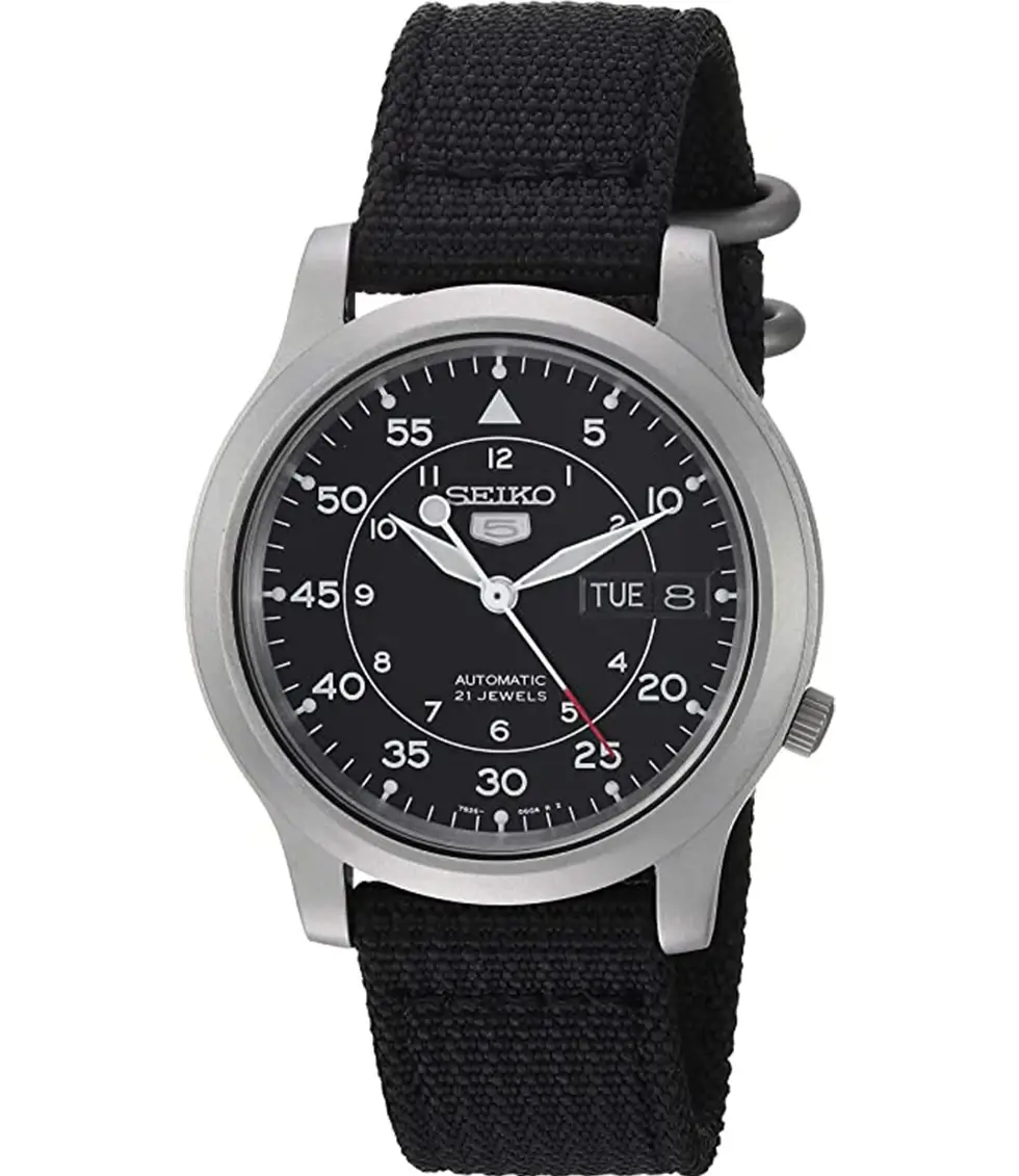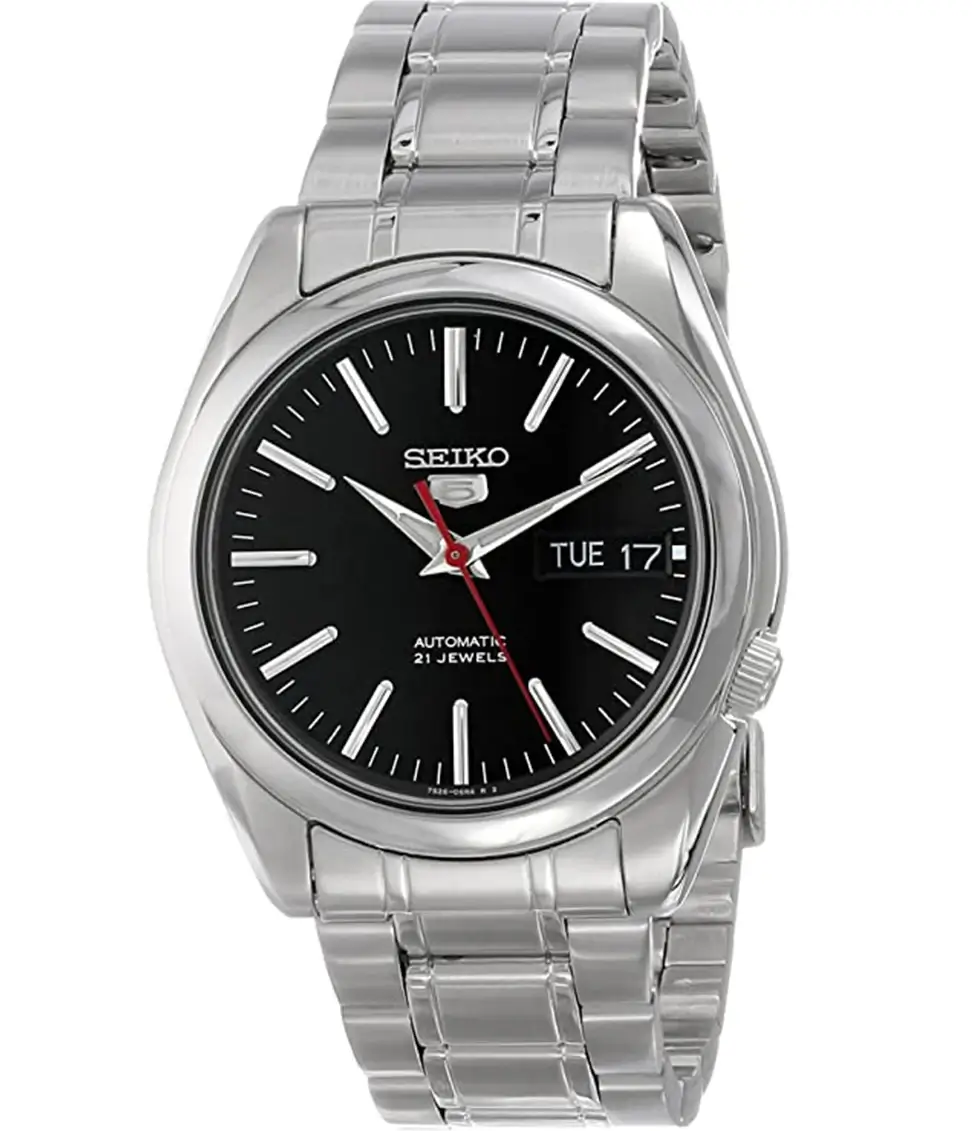Seiko 5 watches are known for how well they work and how affordable they are for many people. The well-known Seiko 5 SNKL23 watch costs less than $150. At this price point, no other watchmaker in the world offers a product of this quality and build. The case diameter of the Seiko 5 SNKL23 is 38 mm, and its thickness is nearly 10.6 mm. The distance between the lugs is 45.5mm, which adds a chic and classy touch to the design. It has a beautiful, but not overpowering, case design. The crown is located at 4 o’clock, which is the most notable feature of the Seiko 5 SNKL23. This distinguishes it from the other Seiko 5 watches.