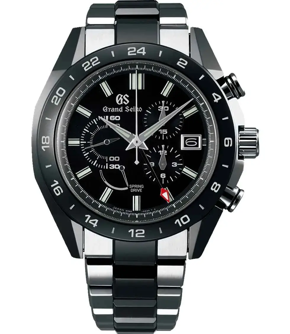 Powered by Grand Seiko’s innovative Caliber 9R86 Spring Drive movement, the watch delivers remarkable accuracy, combining the best of mechanical and quartz elements. The chronograph function allows for precise timing, while the GMT feature, indicated by the red GMT hand, enables tracking of two time zones simultaneously, making it a practical tool for travelers.