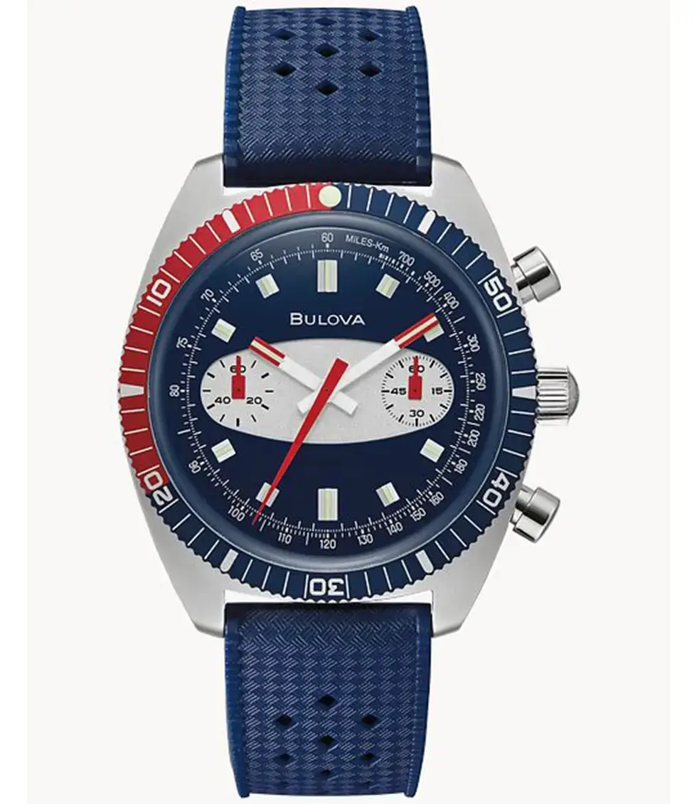 The Bulova Archives Surfboard Chronograph is a watch that was inspired by the surf culture of the 1970s. This watch features a unique design with a 40mm stainless steel case and a blue silicone strap.