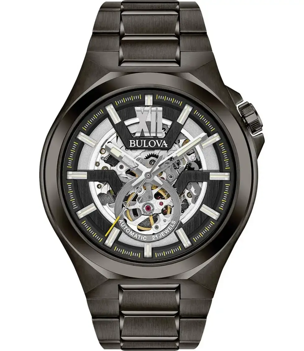 The Bulova Maquina Automatic Open Aperture is a watch that features a unique design that showcases the automatic movement at the heart of the watch. This watch features a 46mm stainless steel case with a water resistance rating of 100 meters and a black stainless-steel bracelet.