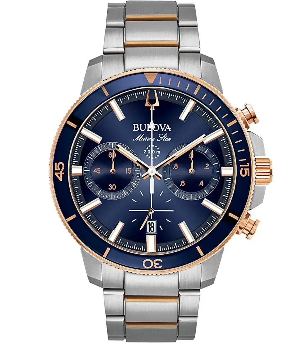 The Bulova Marine Star is a classic watch that features a timeless design and exceptional performance. This watch features a 45mm stainless steel case and a uni-directional bezel that is accented with blue and silver.