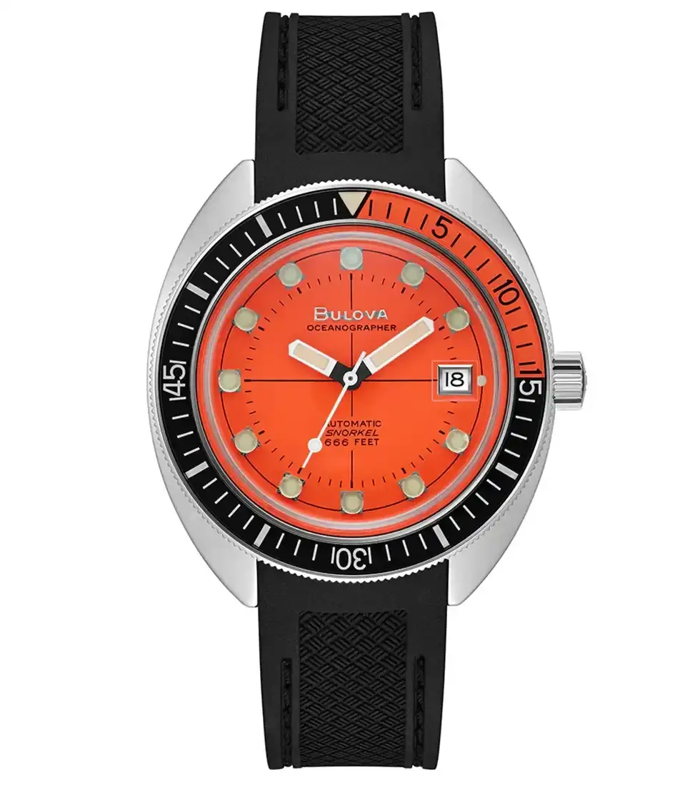 The Bulova Oceanographer Devil Diver Automatic is a watch that pays homage to the brand’s classic dive watches from the 1970s. This watch features a bold, retro design with a 41mm stainless steel case and a black and orange unidirectional bezel. The watch has a water resistance rating of up to 200 meters.